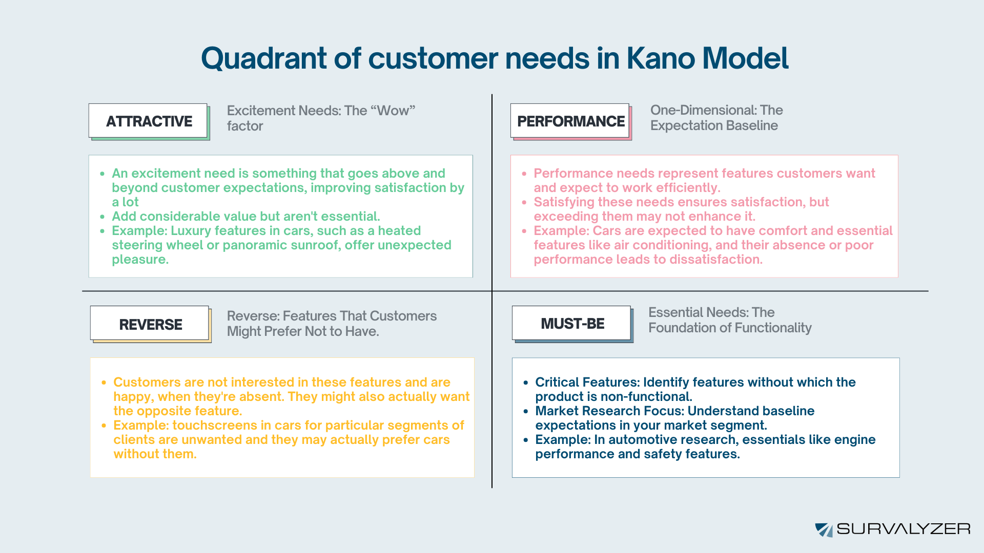 Whether you are a product manager, designer, or marketer, using a Kano diagram can provide valuable insights into customer preferences. This tool categorizes features into must-haves, performance, delighters, and more, helping you prioritize product development.